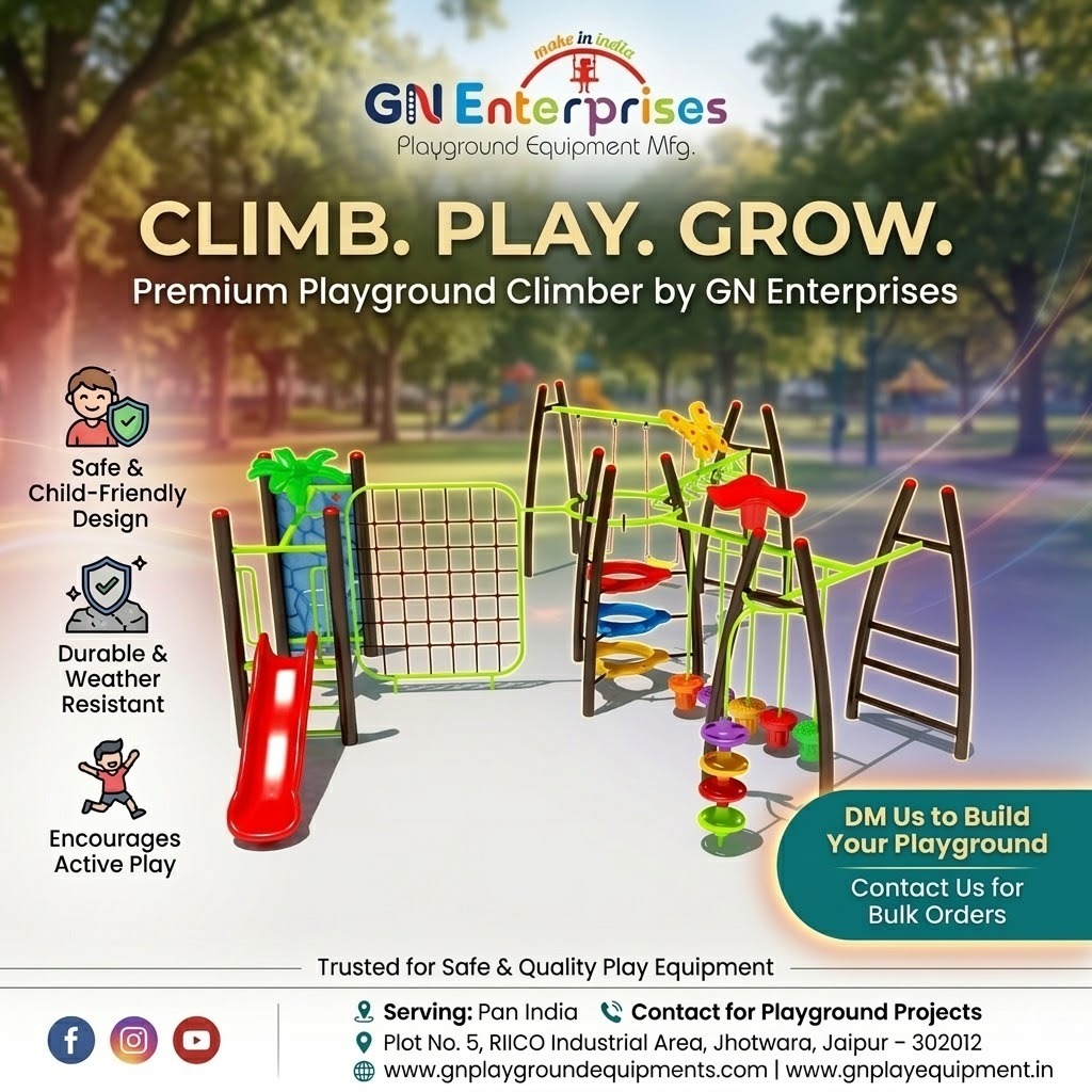 GN Enterprises is a trusted Playground Climber manufacturer and supplier in Jaipur, offering high-quality, durable, and safe climbing equipment for schools, parks, gardens, residential societies, and play areas. Our climbers are designed to improve children’s physical strength, balance, coordination, and confidence while providing endless fun.
